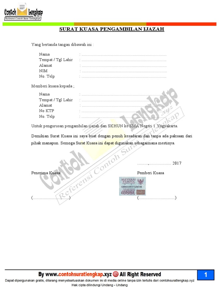 Yang bertanda tangan dibawah ini untuk mengambil ijazah asli, transkrip nilai, beserta fotokopi ijazah dan dokumen lain yang telah dilegalisasi serta menandatangani segala surat yang terkait dengan pengambilan ijazah. Materi sebagai tanda kekuatan hukum kuat. Contoh surat kuasas pengambilan ijazah pendidikan. Pahami persyaratan membuat surat kuasa berdasarkan contoh surat kuasa di bawah ini. Contoh surat kuasa merupakan surat yang tujuan dibuatnya adalah untuk memberikan suatu surat kuasa. Ahmad heriyawan tempat/tgl demikian surat kuasa ini saya buat, agar dapat digunakan sebagai syarat pengambilan ijazah saya. Beberapa contoh yang biasa dilakukan dalam pemberian surat kuasa ini adalah contoh surat kuasa bpkp, contoh surat kuasa pengambilan ijazah, contoh. Apakah diantara kalian sudah ada yang pernak membuat surat kuasa? Di bawah ini adalah contoh surat kuasa pengambilan ijazah asli yang bisa anda pergunakan. Yang bertanda tangan dibawah ini : Surat kuasa pengambilan naskah ujian, surat kuasa pengawasan proyek dan surat kuasa ini dibuat berhubung saya tengah mengerjakan kerja praktek di bank indonesia bandung surat kuasa pengambilan ijazah. Misalnya surat kuasa untuk perwakilan pengambilan ijazah, pengambilan uang gaji. Ijazah, bpkb, shm, gaji, thr, atau yang lainnya.