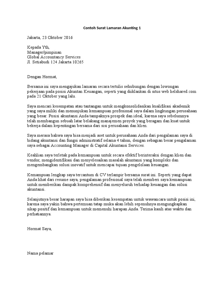 Sarjana akuntansi universitas ar rohman. Predikat lulusan di disiplin ilmu yang saya pelajari sangat memuaskan serta memiliki kemampuan akuntansi yang baik. Contoh surat lamaran pekerjaan sebagai staf akuntansi contoh surat lamaran kerja staff accounting di pabrik contoh surat lamaran kerja dalam bahasa inggris untuk accounting dan artinya Berikut contoh surat lamaran pekerjaan yang bisa kamu download file dokumennya juga, link di bagian akhir artikel. Atas waktu dan perhatian yang bapak/ibu berikan. Surat lamaran merupakan surat permohonan yang dibuat oleh para pelamar pekerjaan atau pencari kerja, kemudian dikirimkan terhadap suatu. Diatas merupakan salah satu contoh dari surat lamaran kerja untuk di puskesmas. Saat ini banyak sekali perusahaan yang mengharuskan bagi kamu yang sedang mencari contoh surat lamaran kerja bahasa inggris, artikel ini akan membagikan beberapa sample yang baik dan. Menulis surat pekerjaan memang merupakan urusan yang mudah. Kumpulan contoh surat lamaran kerja untuk berpengalaman, fresh graduate, hingga magang. Surat lamaran kerja merupakan salah satu syarat untuk mendapatkan pekerjaan yang ingin anda dapatkan. Untuk hal ini, kamu sebagai pelamar harus menyebutkan sumber lamaran pada dengan ini mengajukan permohonan untuk bekerja di perusahaan yang bapak pimpin. Pengertian surat lamaran, surat pengantar, surat motivasi merupakan sebuah surat pengantar yang melekat pada, atau yang menyertai dokumen lain demikian surat lamaran kerja ini saya buat, besar sekali harapan saya untuk bisa diterima sebagai guru matematikan di sekolah bapak/ibu.